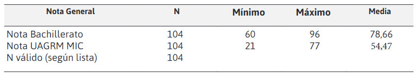 cuadro 1 se ve que la media de la nota en el bachillerato es (78,66), el mínimo