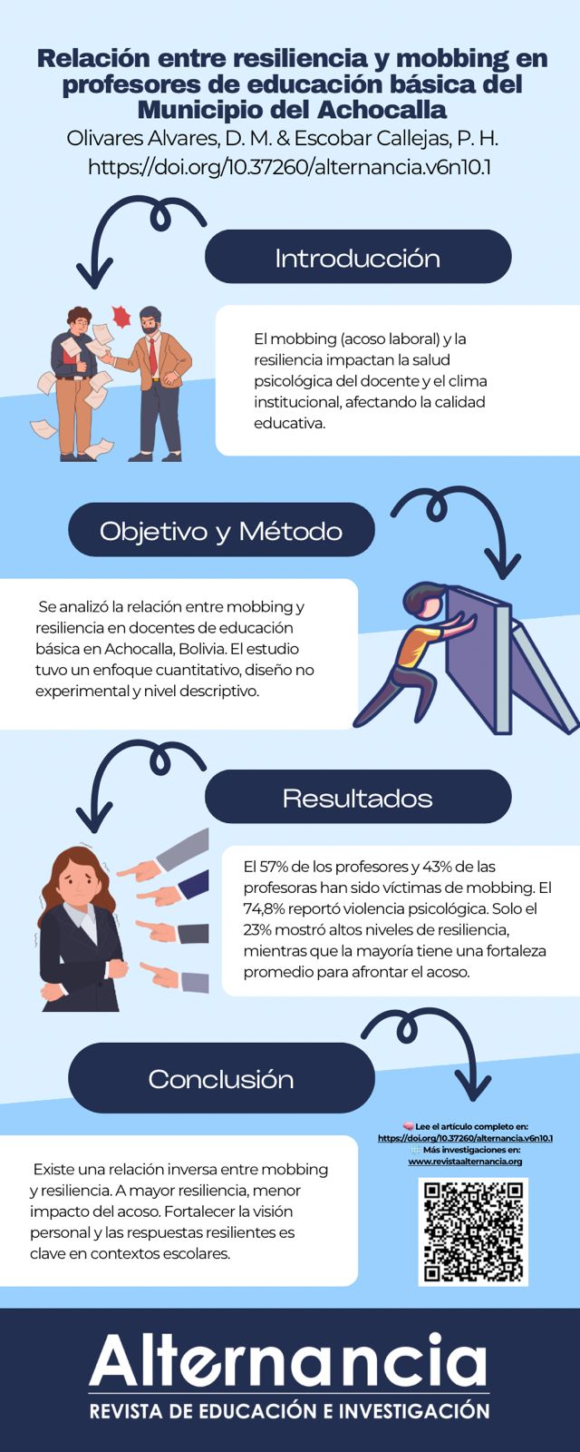 Mobbing and resilience are antagonistic factors of great impact on the economy of organizations that affect the physical-psychological health of the individual. For this reason, the objective of the study was to determine the type of relationship betweenthem, taking as a reference basic education teachers in the Municipality of Achocalla, Bolivia. The methodology had a quantitative approach, with a descriptive level and a non-experimental design. Among the results, 57% of the teachers have suffered mobbing, while 43% of the female teachers have suffered mobbing; likewise, 74.8% of the teaching staff have experienced psychological violence and although 50.4% of the teachers show an average strength to overcome it, only 23% show a high level of resilience. It was concluded that there are inverse relationships between: “Resilience and Mobbing”; “Self- view and Mobbing”; “View of the problem and Mobbing”; “Resilient response and Mobbing”.